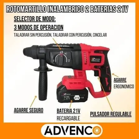 El Rotomartillo Inalámbrico 900W está diseñado para ofrecer el máximo rendimiento en todo tipo de trabajos. Ideal para perforar, cincelar y trabajar en superficies resistentes como concreto, ladrillo y metal, es la herramienta perfecta tanto para profesionales como para el hogar.